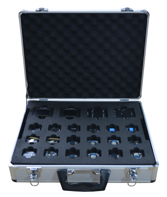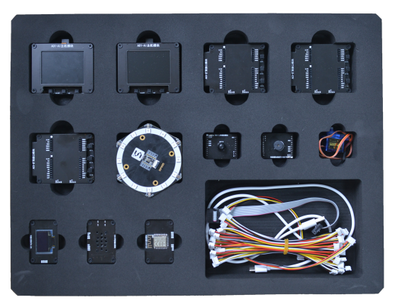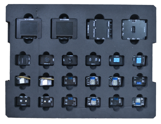 本設(shè)備采用實(shí)驗(yàn)箱形式,實(shí)驗(yàn)箱內(nèi)包含兩層內(nèi)襯,內(nèi)襯上放有無線通訊模塊(LoRa、低功耗WiFi、ZigBee、等),通用模塊(按鍵、OLED 顯示、溫濕度、舵機(jī)、RFID、RGB彩燈、LED燈、蜂鳴器、人體感應(yīng)、光電模塊等),人工智能模塊(k210主板,攝像頭,顯示屏,聲音采集模塊等),其他輔助材料(色塊,人臉模型,20種物體圖卡,條形碼圖卡,USB線等)。