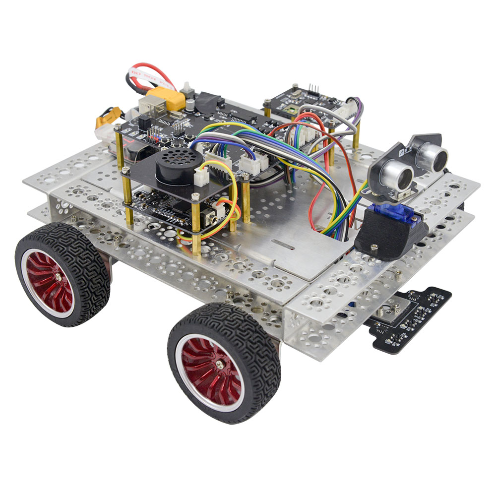 該平臺(tái)是一款集機(jī)械、電子、編程為一體的人工智能編程教育機(jī)器人套件,金屬車身,采用Atmel mega2560控制器,由主控模塊、藍(lán)牙模塊、語(yǔ)音模塊、電機(jī)模塊、超聲波模塊、循跡模塊等組成;內(nèi)置十余種傳感器,功能強(qiáng)大,能夠?qū)崿F(xiàn)語(yǔ)音控制、智能尋跡、自動(dòng)避障、藍(lán)牙通信等功能。
